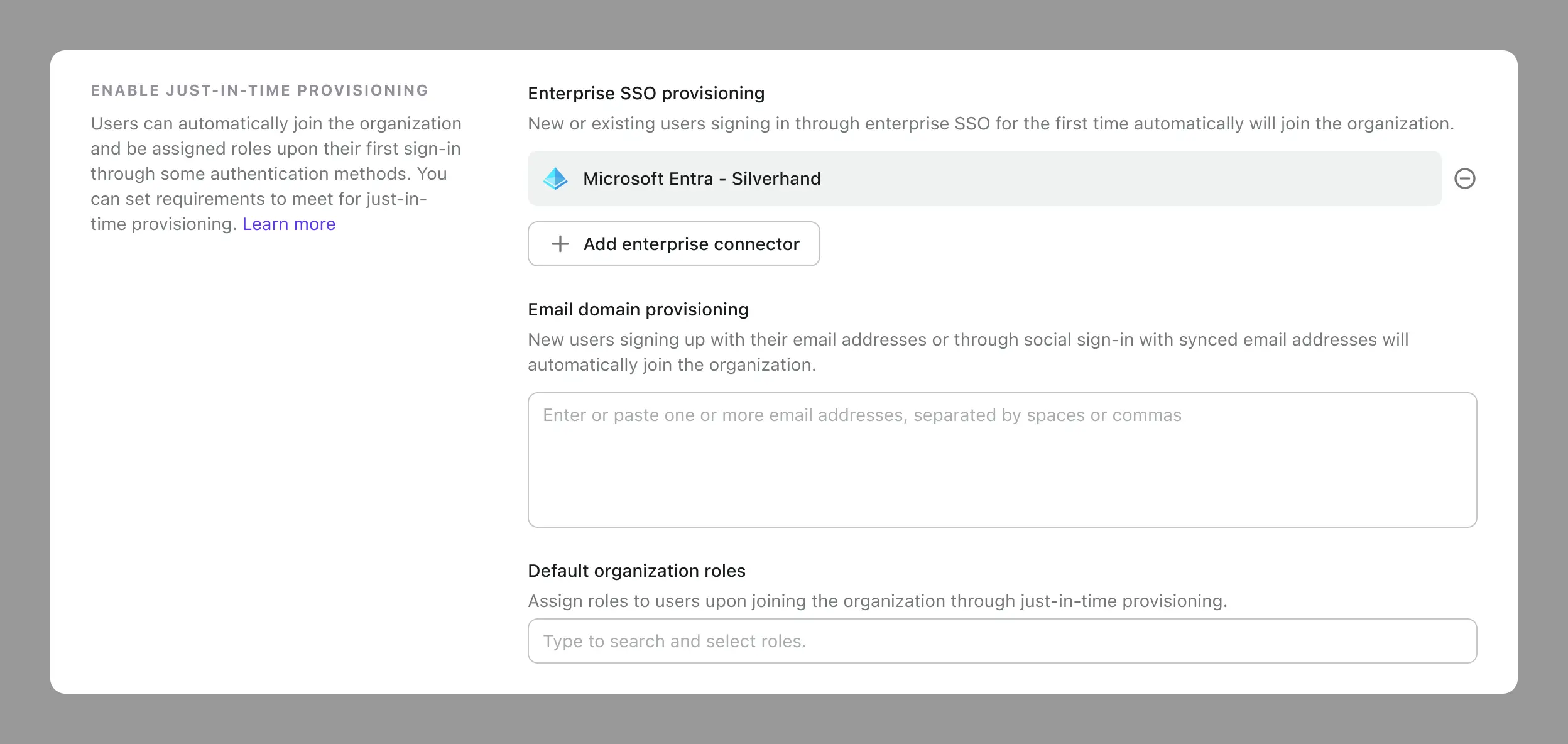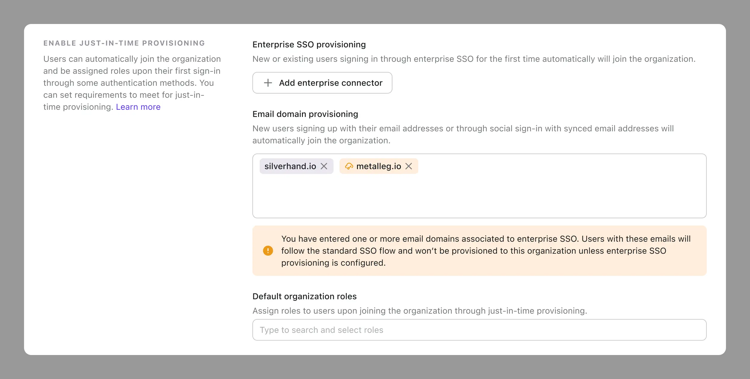 Por ejemplo, si habilitas el aprovisionamiento por dominio de correo para un usuario existente y luego quieres incorporar a otro grupo de usuarios con un rol diferente, ¿debería el usuario incorporado previamente recibir el nuevo rol que configuraste? Esto crea un escenario complejo para las "actualizaciones just-in-time". El comportamiento exacto suele depender de cómo se configure la aplicación y la integración con el IdP. Te damos este control a ti, permitiéndote diseñar tu sistema de aprovisionamiento libremente y gestionar los escenarios más frecuentes para la creación de nuevas cuentas y la incorporación a organizaciones.
