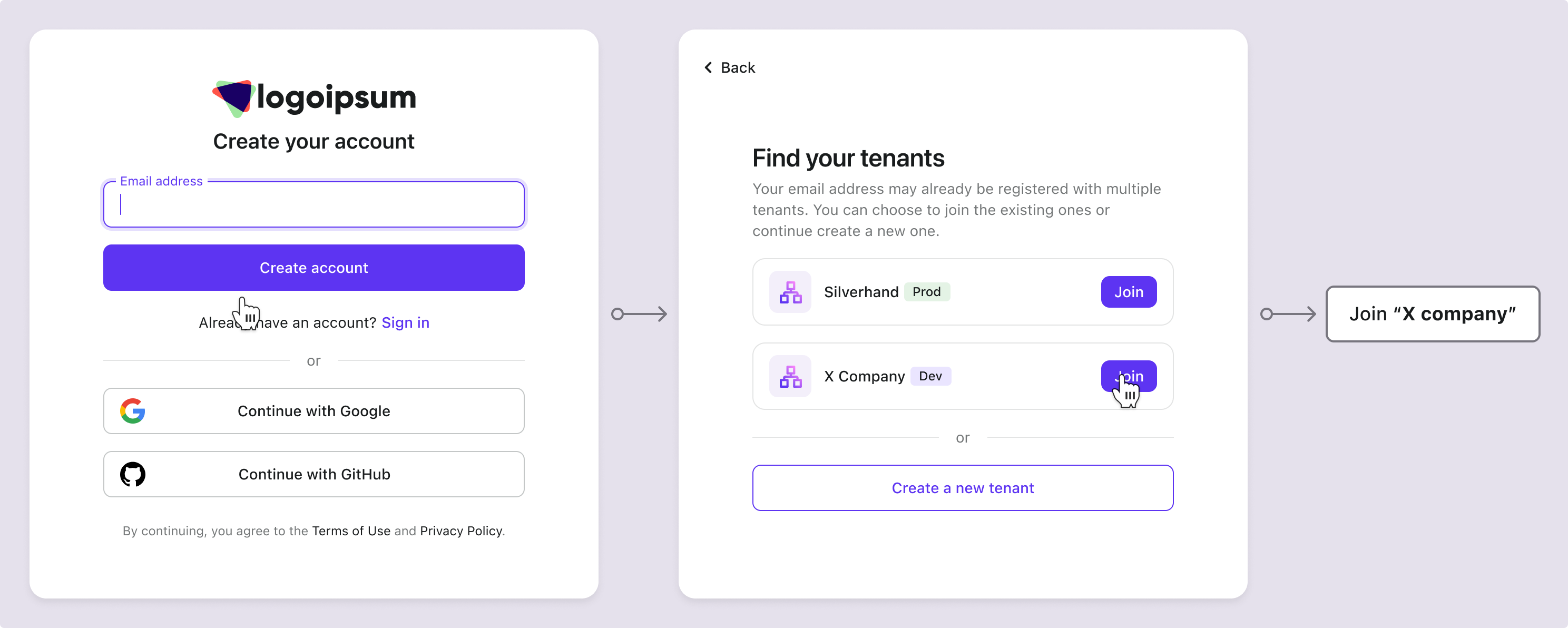 组织 (Organization) 列表和加入流程通常出现在用户入职(onboarding)期间。 例如,当管理员邀请某人加入工作区,但该用户跳过了邮件邀请,直接在应用中登录或注册时。